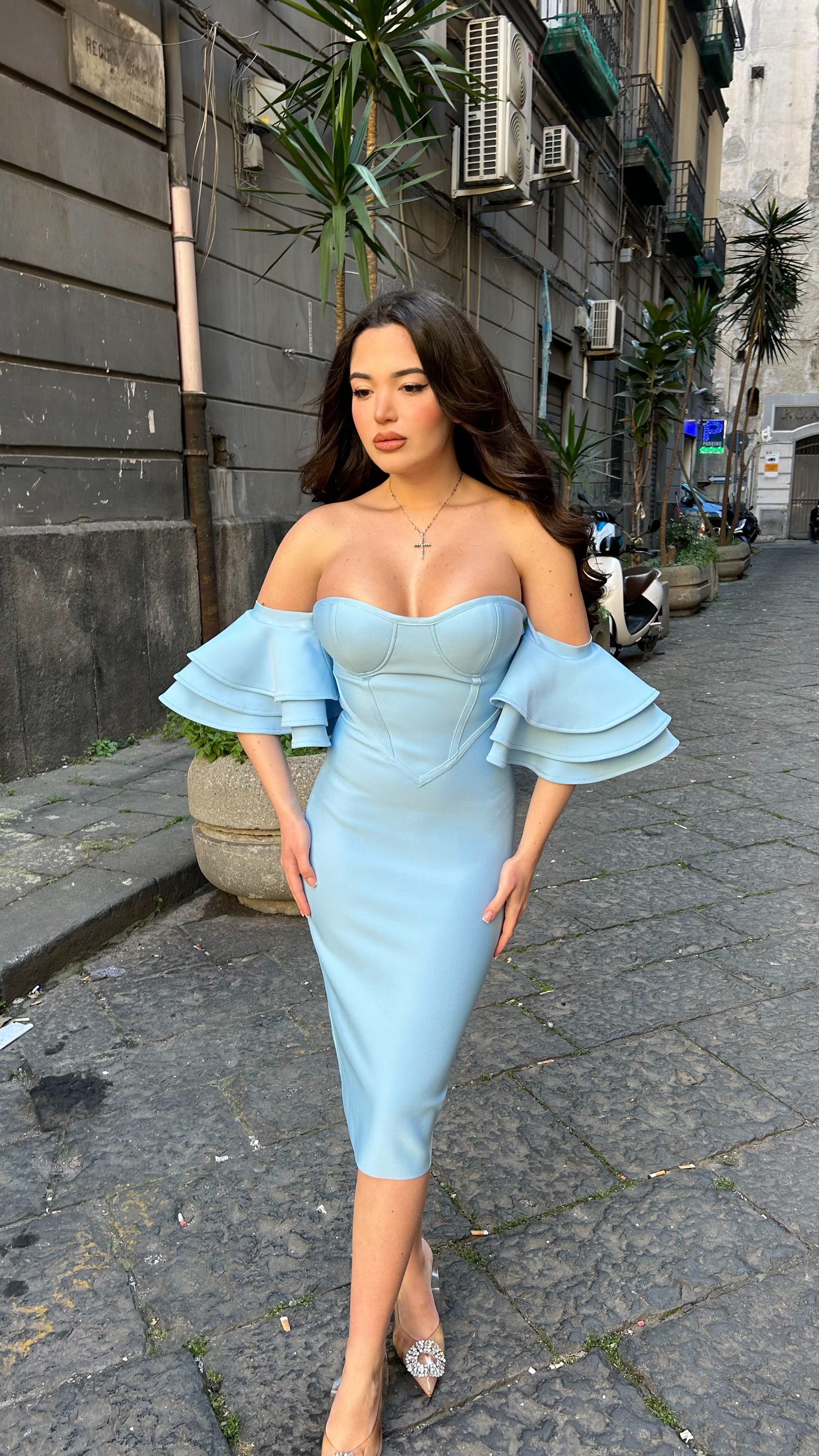 Abito Bandage contenitivo Modellante, la modella indossa tg S